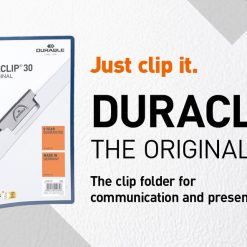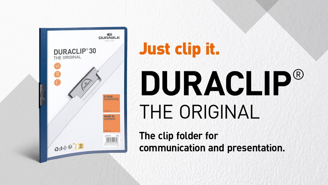 Το αυθεντικό DURACLIP από πλαστικό PVC με ειδικό ατσάλινο κλιπ με ελατήριο. Ιδανικό για παρουσιάσεις, αρχειοθέτηση, εισαγωγικά, σημειώσεις σε συνέδρια/σεμινάρια και εκθέσεις. Το ντοσιέ DURACLIP 30 έχει χωρητικότητα 30 φύλλων Α4, διαφανές μπροστινό εξώφυλλο και χρωματιστό πίσω μέρος και ράχη. Διατίθεται πλήρης σειρά πρόσθετων αξεσουάρ. Οι αποτυπώσεις στο εξώφυλλο, όπως τα λογότυπα της εταιρείας, μετατρέπουν το DURACLIP σε μια μοναδική διαφημιστική δυνατότητα. Το DURACLIP μπορεί επίσης να παραδοθεί σε ειδικά χρώματα. Το σύστημα DURACLIP®: Τραβήξτε έξω το κλιπ, τοποθετήστε τα έγγραφα και πιέστε πίσω το κλιπ – απλό! Το μοναδικό ατσάλινο κλιπ με ελατήριο προσαρμόζεται στον αριθμό των φύλλων – κάθε φορά.